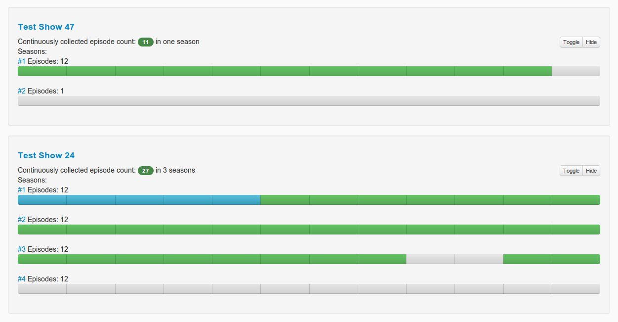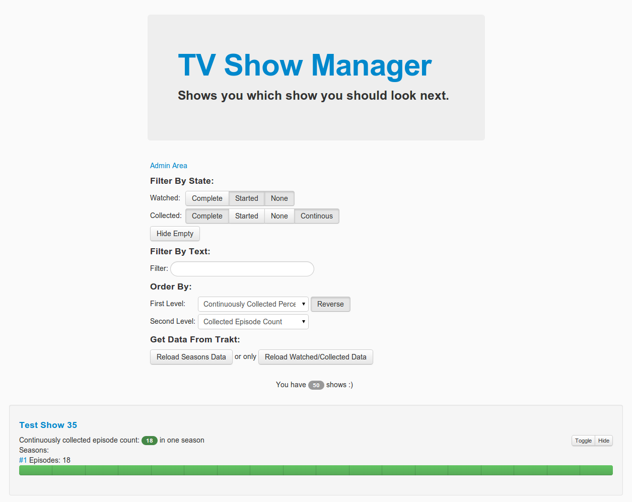 So kann zum Beispiel eine Serie eingeklappt (Toggle-Button) oder versteckt (Hide-Button) werden. Zu jeder sichtbaren Serie werden eine Reihe von Informationen angezeigt. Über den Titel kommt man direkt zur Trakt Seite der Serie und über die Nummern der Staffel zu dieser Staffel der Serie auf Trakt. Unter dem Titel wird angezeigt wieviel Episoden aufeinander folgend schon im Besitz des Benutzers sind. So sieht man, wie vollständig eine bestimmte Serie schon ist und kann dies heranziehen um zu entscheiden welche Serie man als nächstes schauen sollte. Welche Episoden im Einzelnen schon besitzt bzw. angeschaut wurden wird anhand eines aufgeteilten Balkens für jede Staffel der Serie dargestellt. Blaue Balkenabschnitte sind Episoden die der Benutzer schon gesehen hat, grüne markieren den Besitz und graue besitzen keins der vorangegangen Attribute. Durch die grauen Abschnitte weiß man direkt welche Episoden noch angeschafft werden müssen um eine Staffel komplett zu haben. Die TV Serien können anhand verschiedener Kriterien gefiltert werden, auch mit einer Textsuche. Um herausfinden welche Serien als nächstes geschaut werden sollte gibt es unterschiedliche Methoden um die Serien zu sortieren. Außerdem können die Trakt Daten über einen Klick auf die entsprechende Schaltfläche aktualisiert werden.